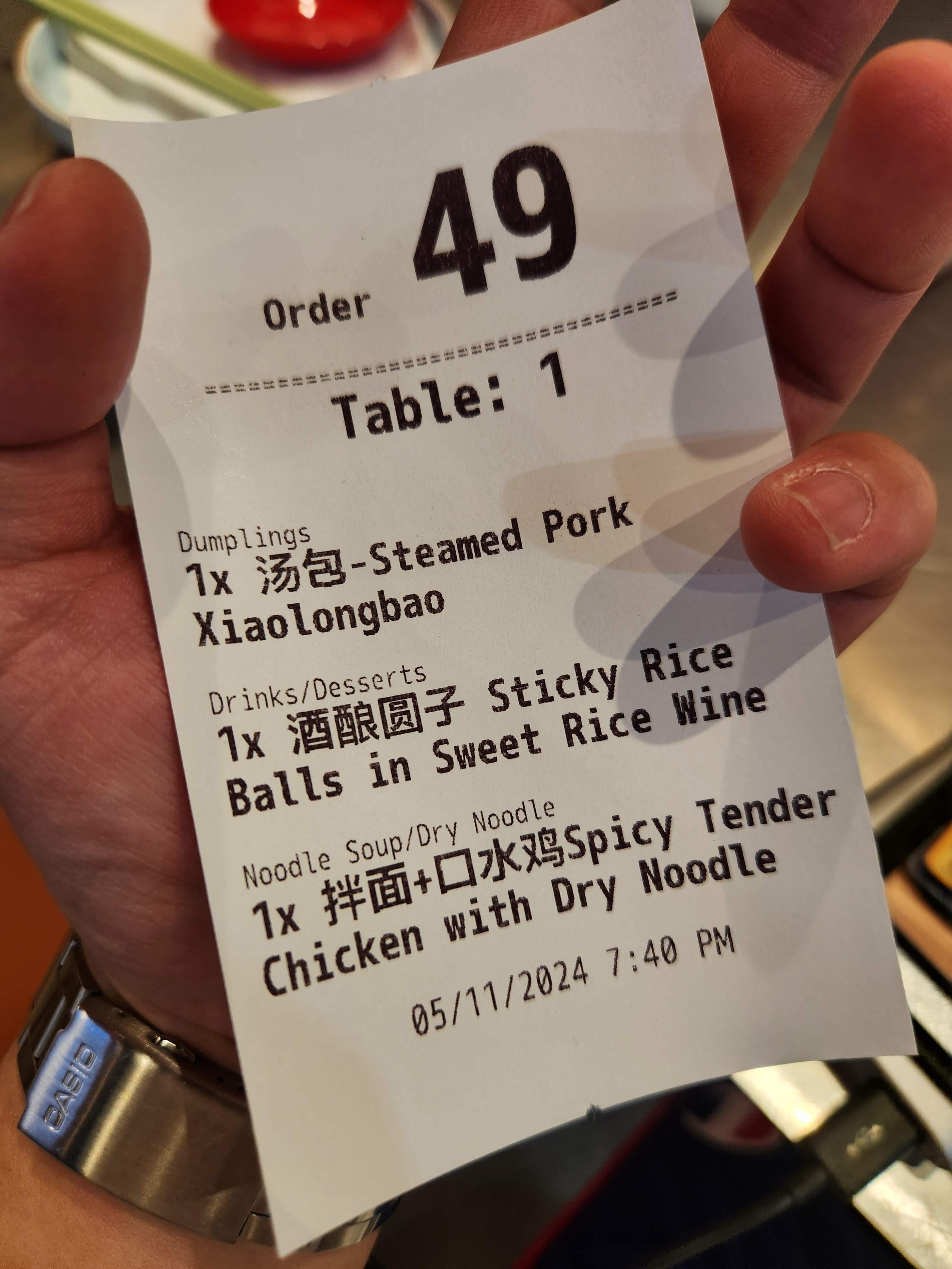 저희는 샤오롱바오 한판, 치킨과 마른면? 그리고 제가 술인줄 알고 시킨 스틱키 라이스 볼, 인 스윗 라이스 와인...